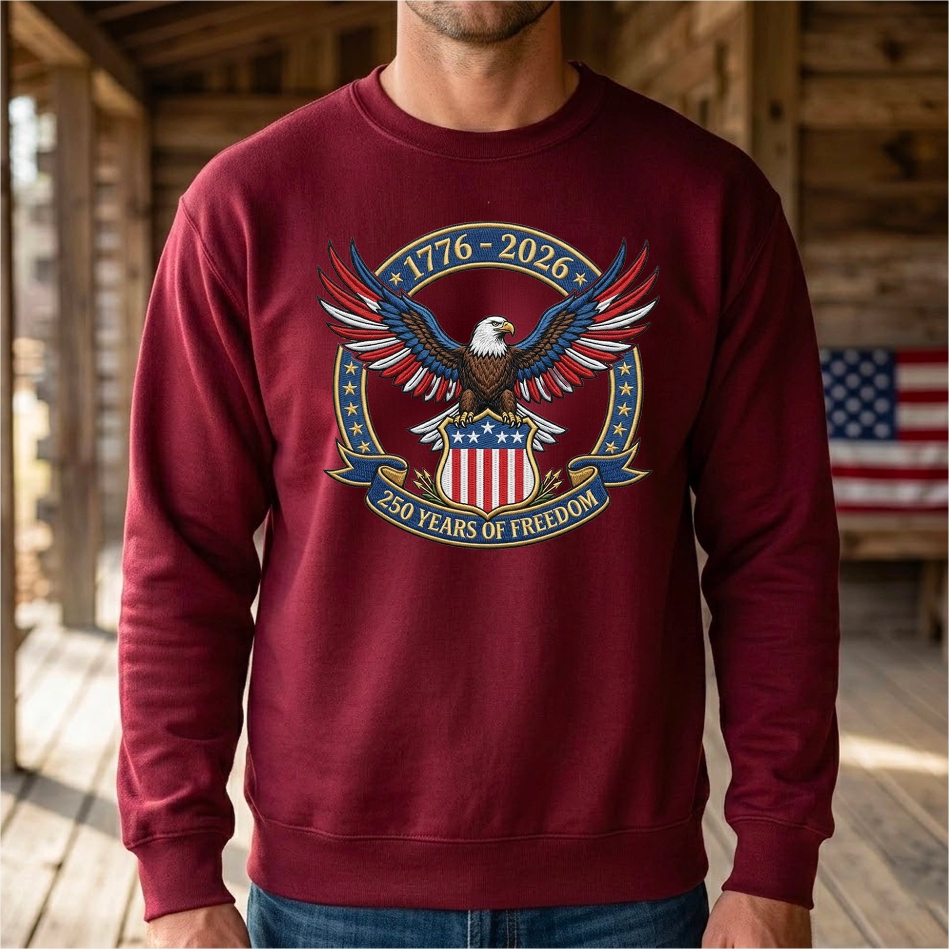 The 1776–2026 USA Flag Embroidered Sweatshirt features premium embroidered detailing inspired by the American flag and the spirit of independence. The textured stitching adds depth and durability, creating a polished look that stands out while feeling comfortable to wear every day.