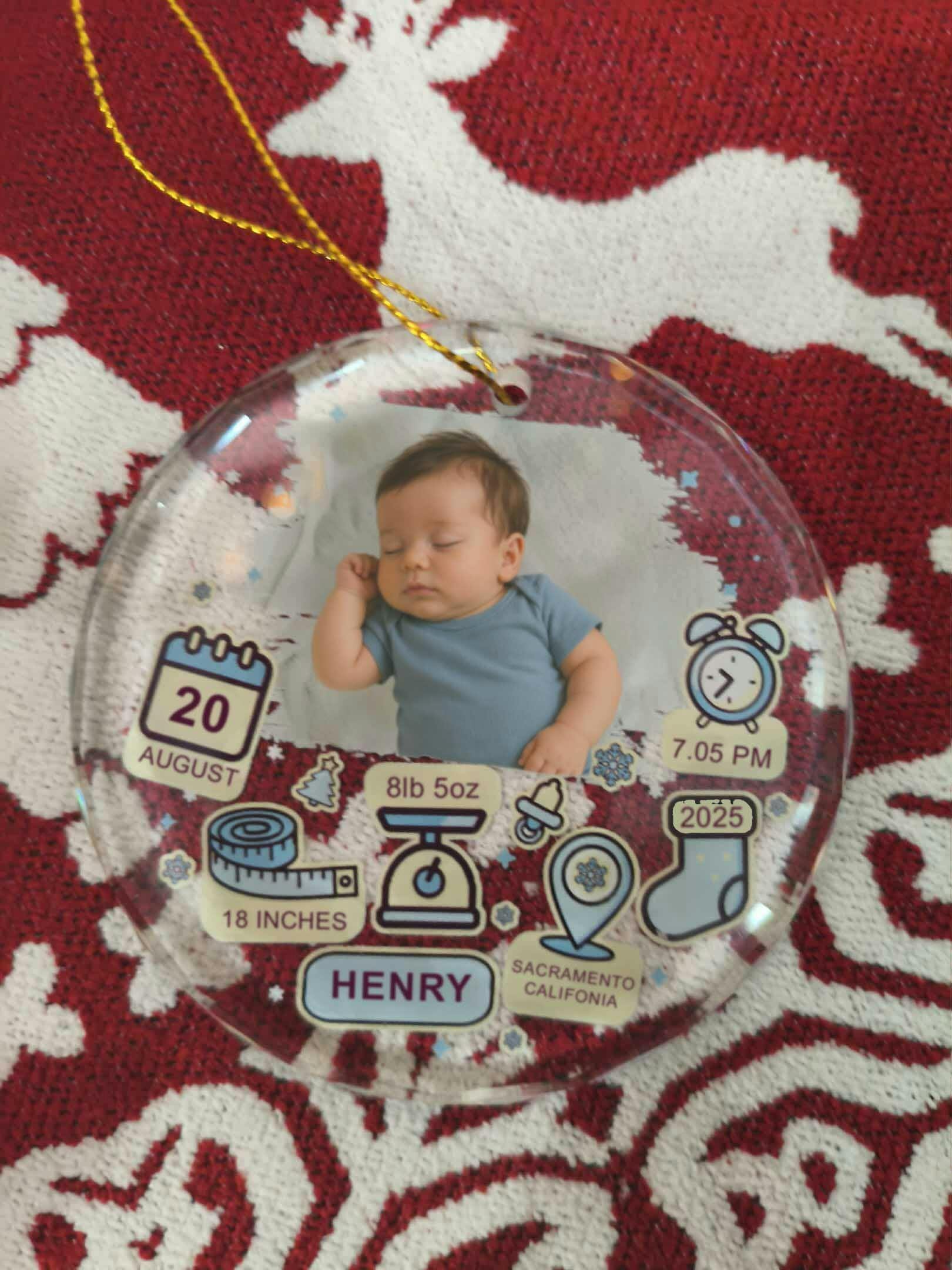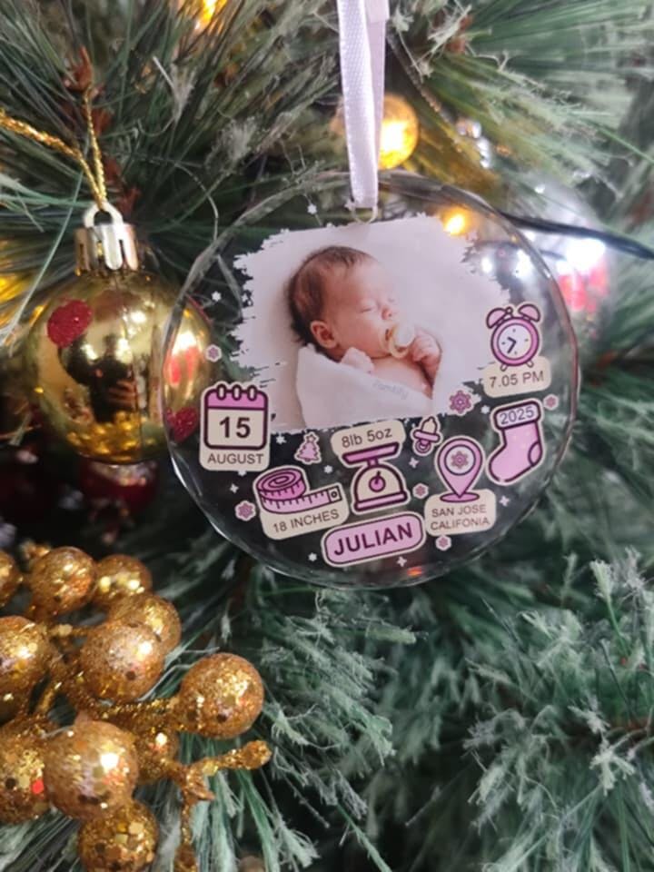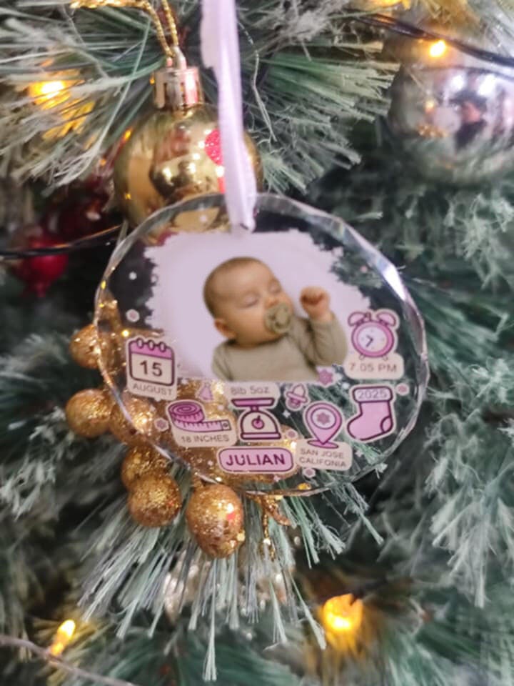 Each ornament is carefully polished for a crystal-clear finish — elegant, timeless, and made to last. Whether displayed on your tree, mantle, or given as a personalized family gift, it’s a beautiful reminder of the joy and love that began this very first Christmas together.