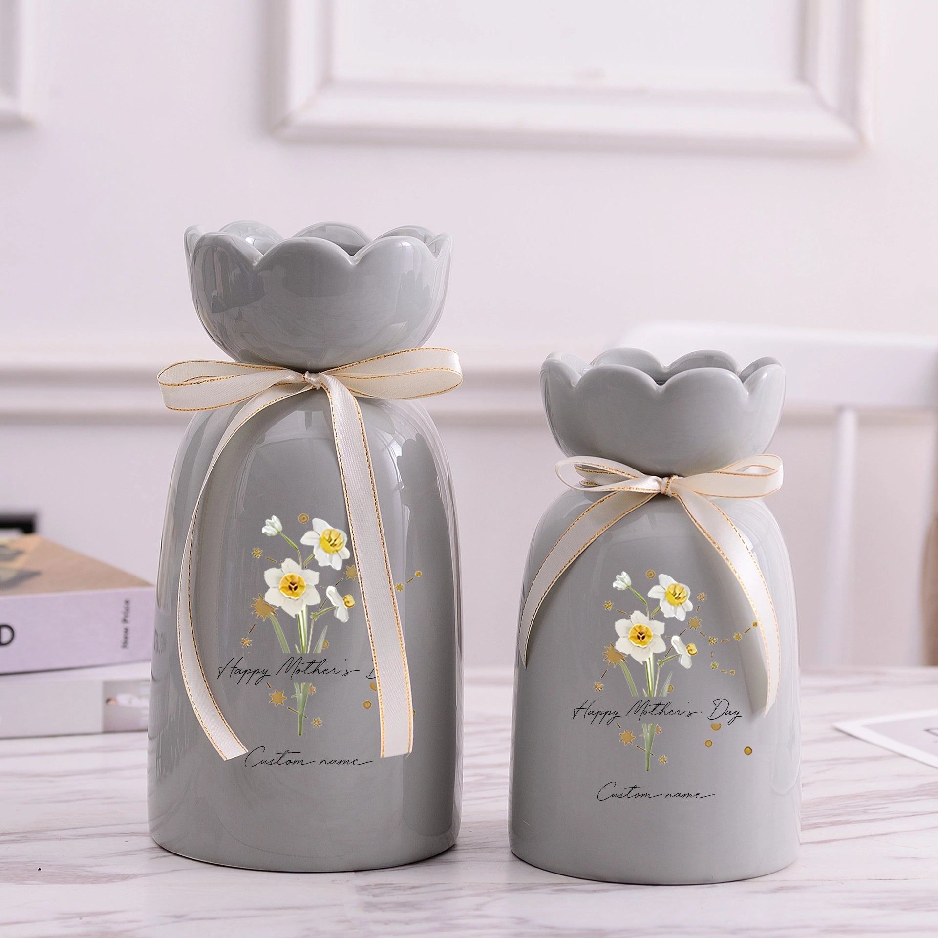 Crafted from smooth white ceramic, this delicate bud vase features a soft wavy bottle opening and a light gold ribbon gently tied at the neck — a subtle touch that feels both graceful and warm. Each vase showcases a beautifully illustrated birth flower, unique to the month it represents, accented with fine gold details that catch the light just enough to feel special. Beside the floral design, a custom name is printed, turning this piece into a one-of-a-kind family keepsake made just for her.