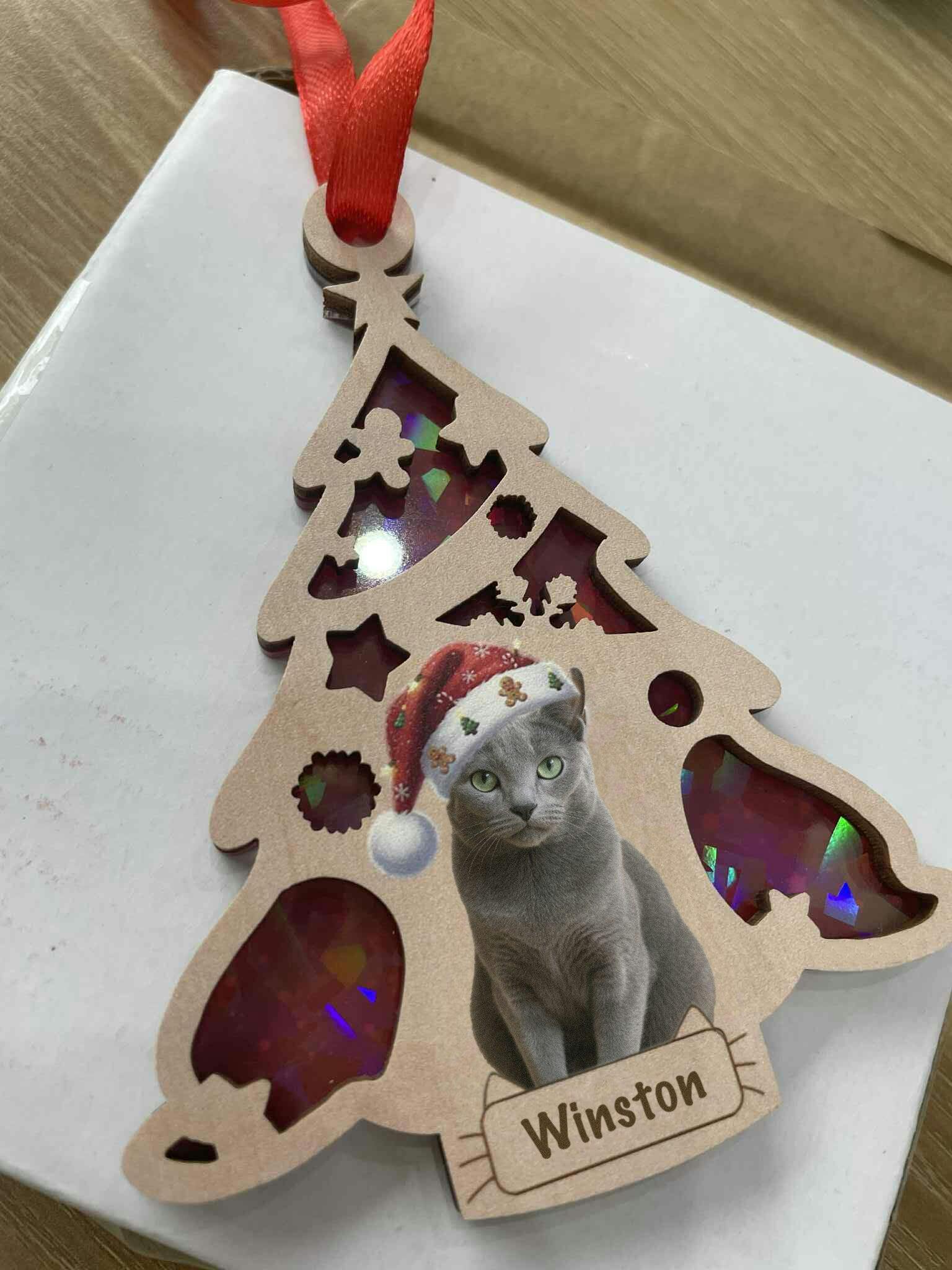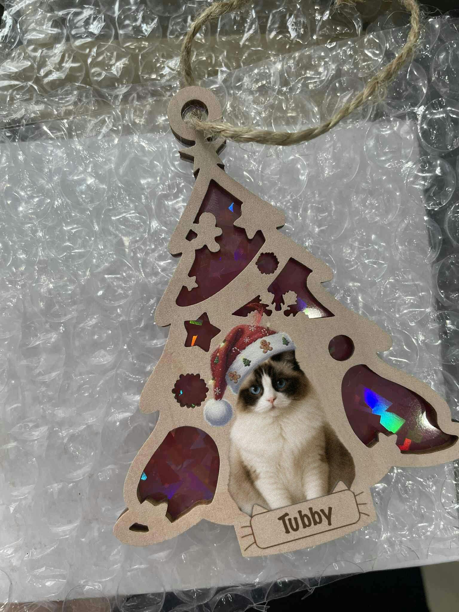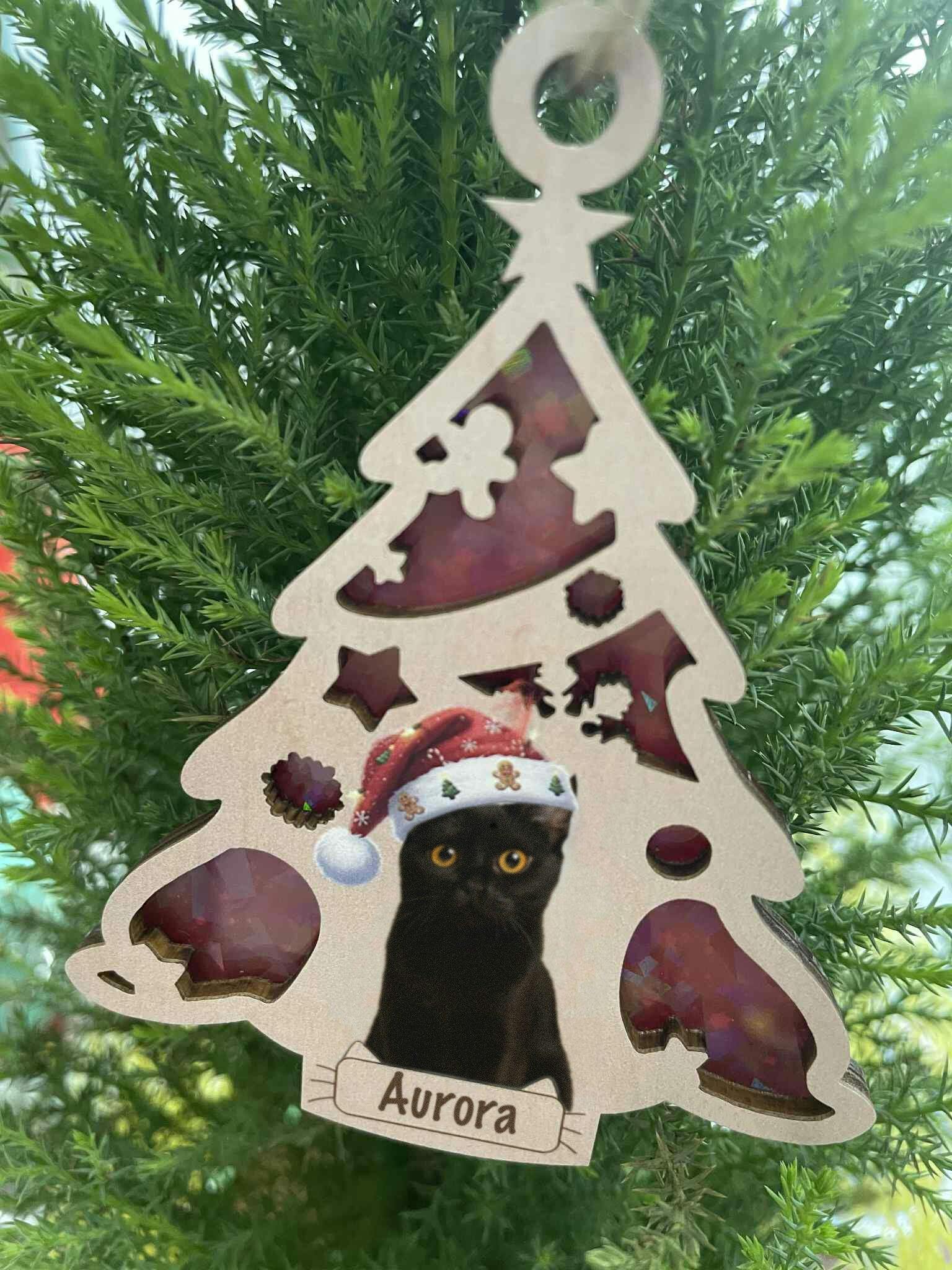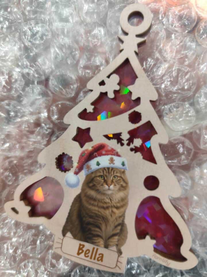 Handcrafted from premium layered wood and designed with a softly glowing red backdrop, this ornament captures the cozy magic of Christmas lights and the tender bond between you and your cat. Personalize it with your cat’s photo and name to create a truly one-of-a-kind custom ornament — a special reminder that your beloved companion is always part of the celebration.