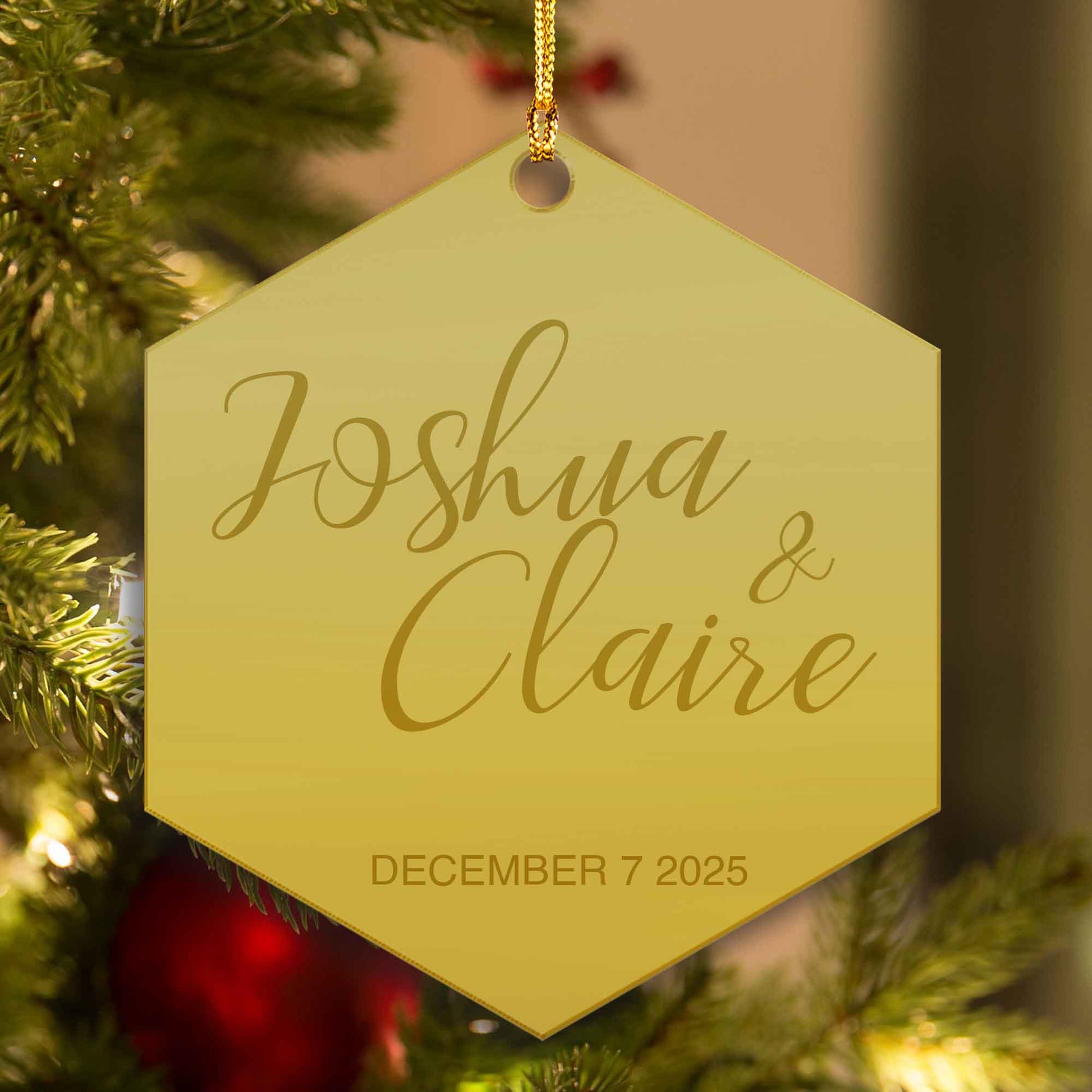 Crafted from premium mirrored acrylic and expertly laser engraved, this custom ornament adds a touch of sophistication to your wedding décor — whether adorning your centerpieces, gift table, or tree. Personalized with your names and date, it transforms into a meaningful family keepsake that continues to sparkle year after year.