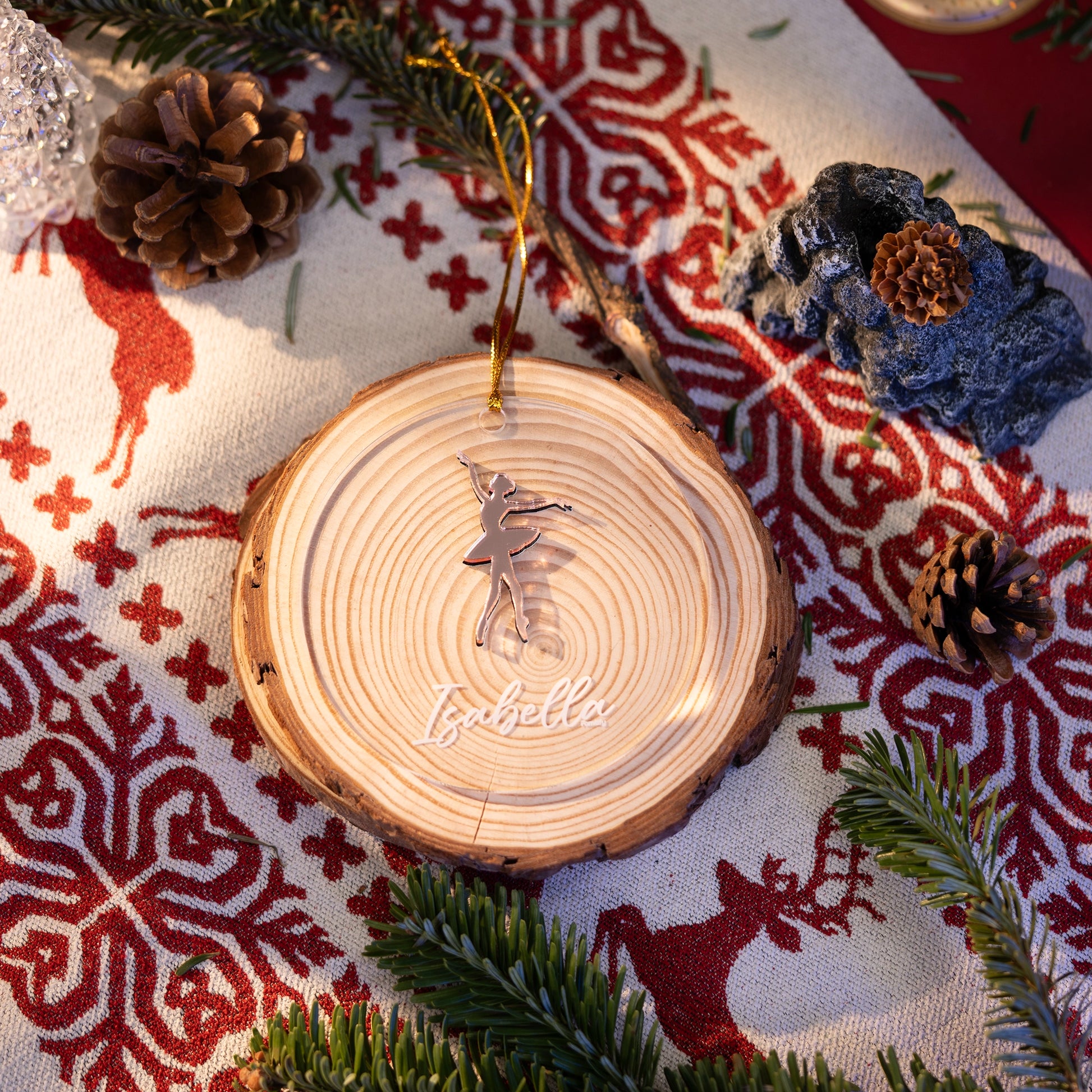 Each piece is expertly laser-cut with a stunning gold mirrored ballerina that catches the light beautifully, reflecting every delicate move. The ornament is engraved and painted with elegant white lettering — or your chosen color — for a truly custom ornament made just for her.