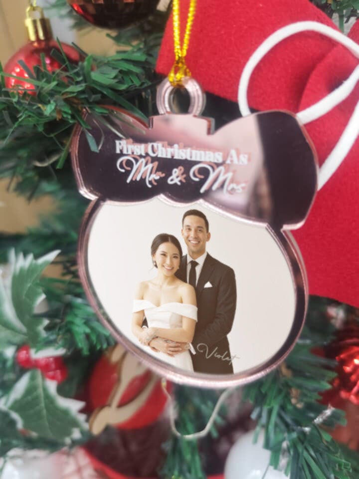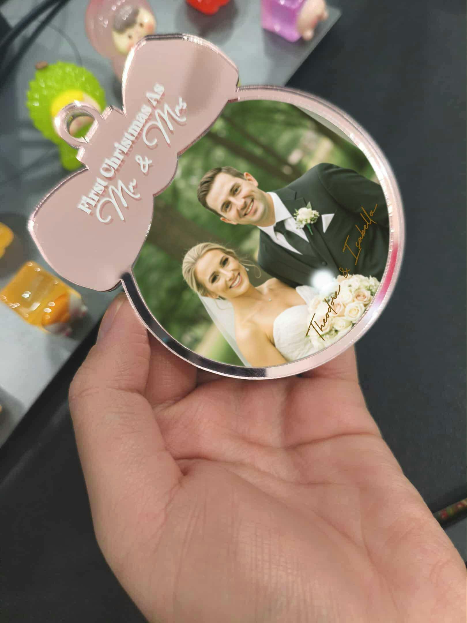 Crafted from premium mirrored acrylic, this elegant ornament reflects light beautifully, adding a touch of sparkle to your Christmas tree or home décor. The smooth surface and crystal-clear clarity make it the perfect canvas for your custom wedding photo, names, and year, turning a simple ornament into a heartfelt personalized family gift you’ll cherish for years to come.