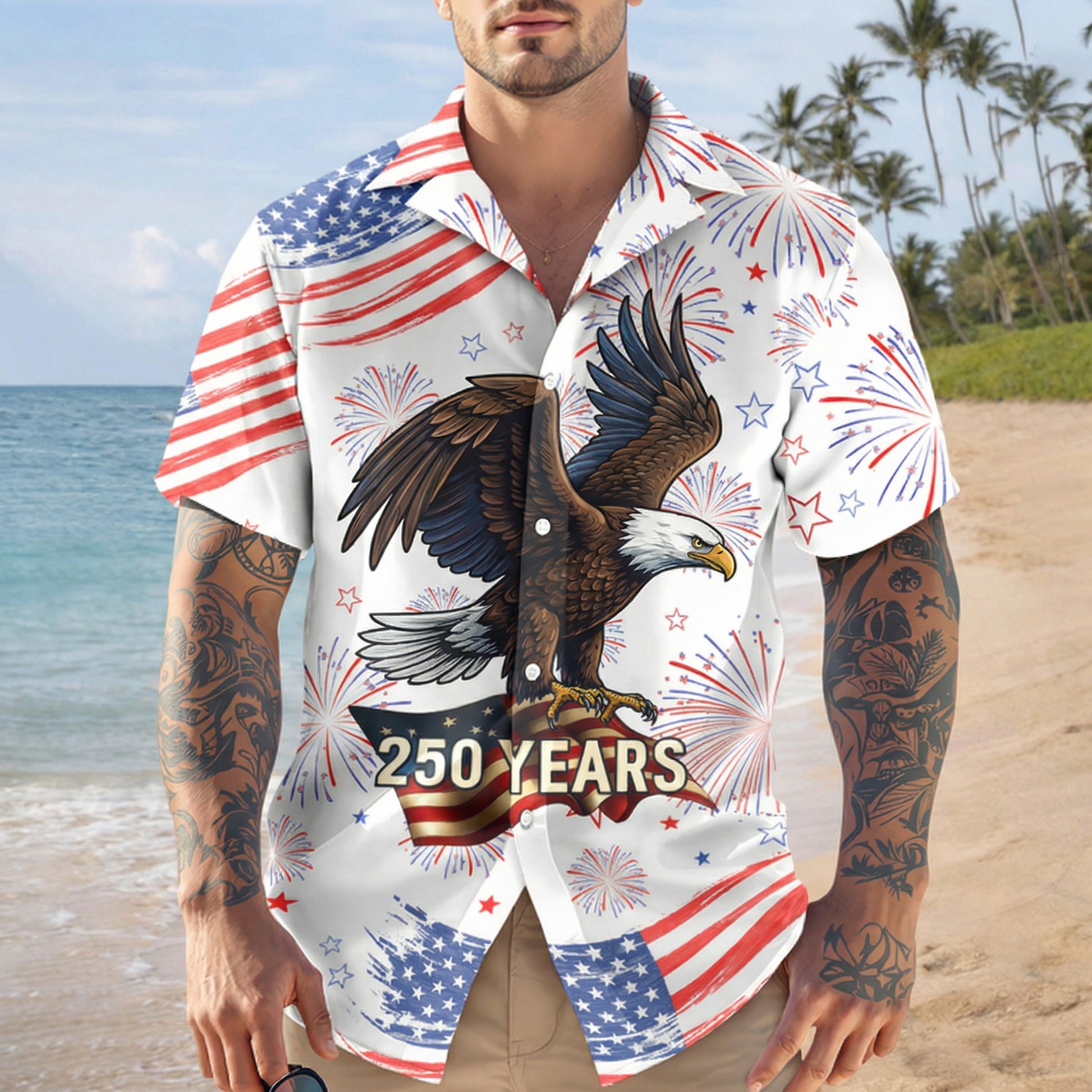 Celebrate America’s milestone anniversary in style with this vibrant USA 250 Years Hawaiian Shirt, featuring a bold bald eagle design set against a festive backdrop of fireworks and American flags. This eye-catching shirt captures the excitement of Independence Day and commemorates 250 years of freedom (1776–2026).