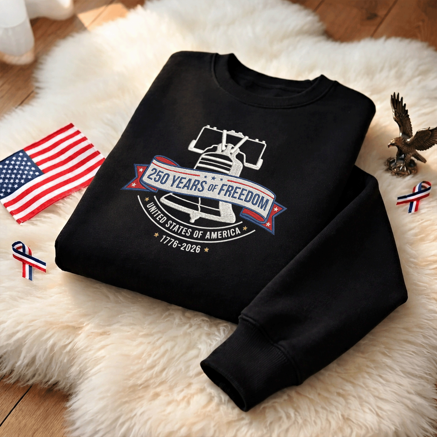 The USA 1776–2026 Liberty Bell Patriotic Embroidered Sweatshirt features detailed embroidery inspired by the iconic Liberty Bell — a lasting symbol of freedom and resilience. The raised stitching adds beautiful texture and depth, creating a refined patriotic look that feels both classic and meaningful.