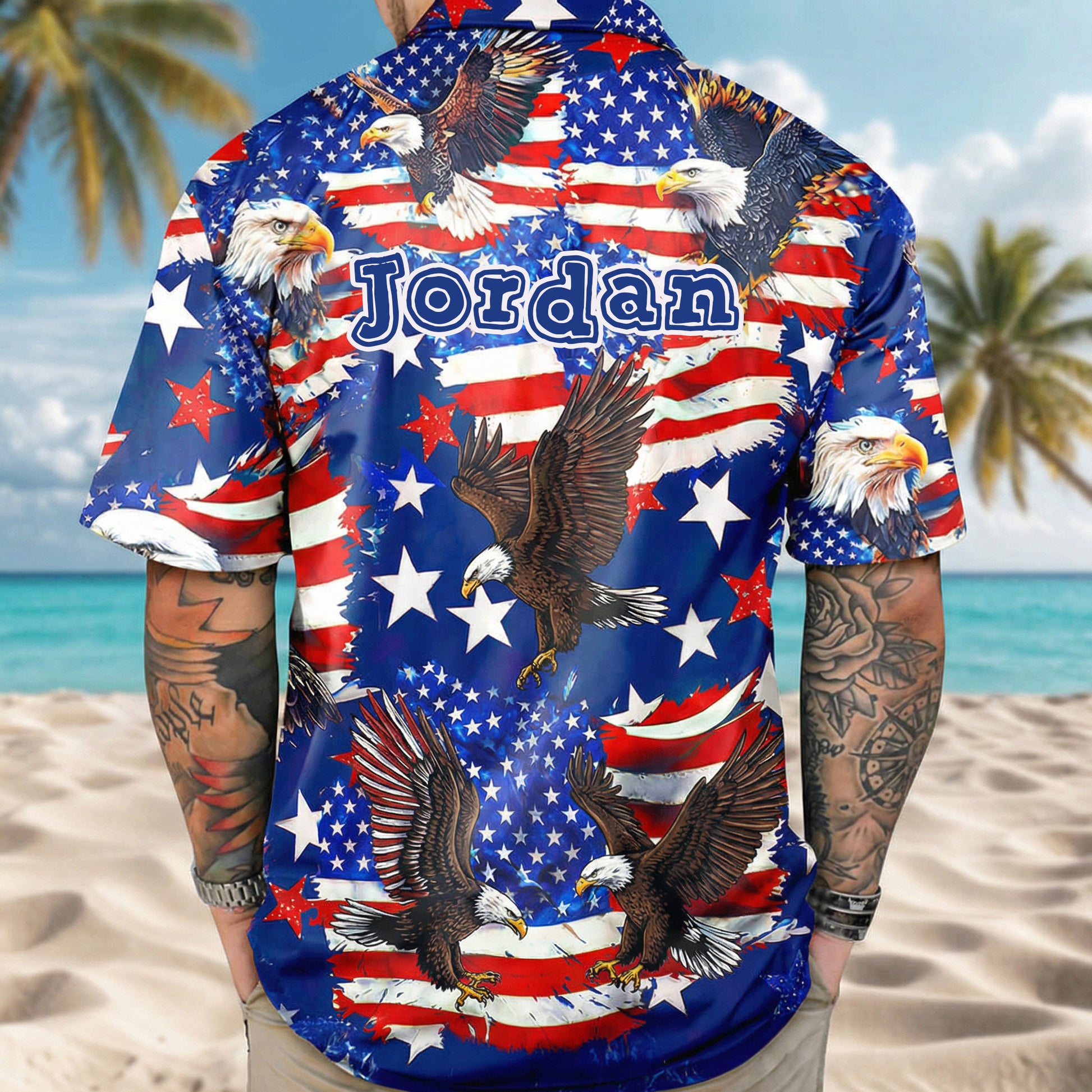 Perfect for Independence Day celebrations, patriotic events, family gatherings, or summer vacations, this shirt delivers both standout style and all-day comfort. The dynamic all-over print blends classic American symbolism with a relaxed tropical aesthetic, creating a unique look that’s festive, modern, and easy to wear. Whether you're watching fireworks, hosting a BBQ, or enjoying a beach day, this shirt helps you celebrate in style.