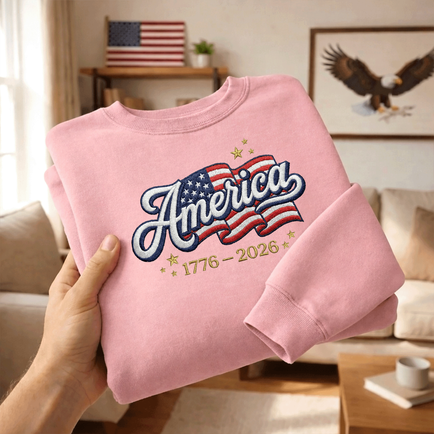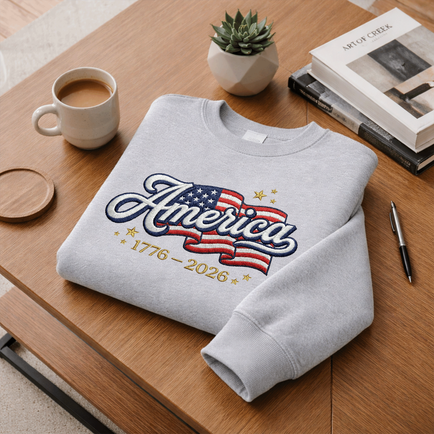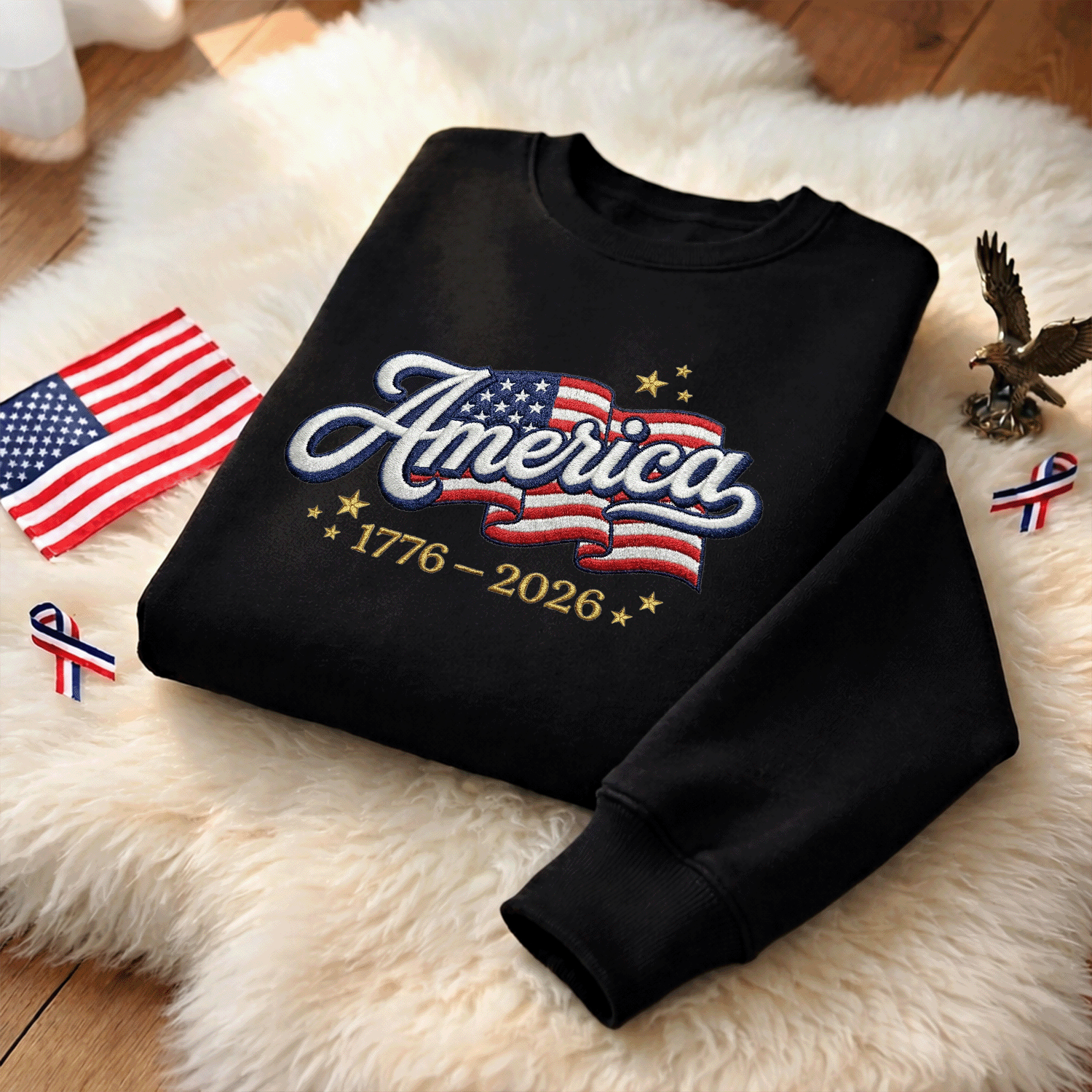 This USA 250th Independence Anniversary embroidered sweatshirt features an elegant “America” script flowing over a flag-inspired wave, accented with subtle stars and a radiant sunburst. The raised, thick embroidery adds rich texture you can feel with every touch, while the balanced red-white-blue palette creates a timeless heritage look inspired by classic collegiate style.